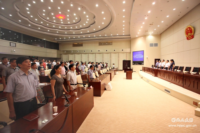 参加会议的省人大常委会机关党组成员和党员干部全体起立奏国际歌