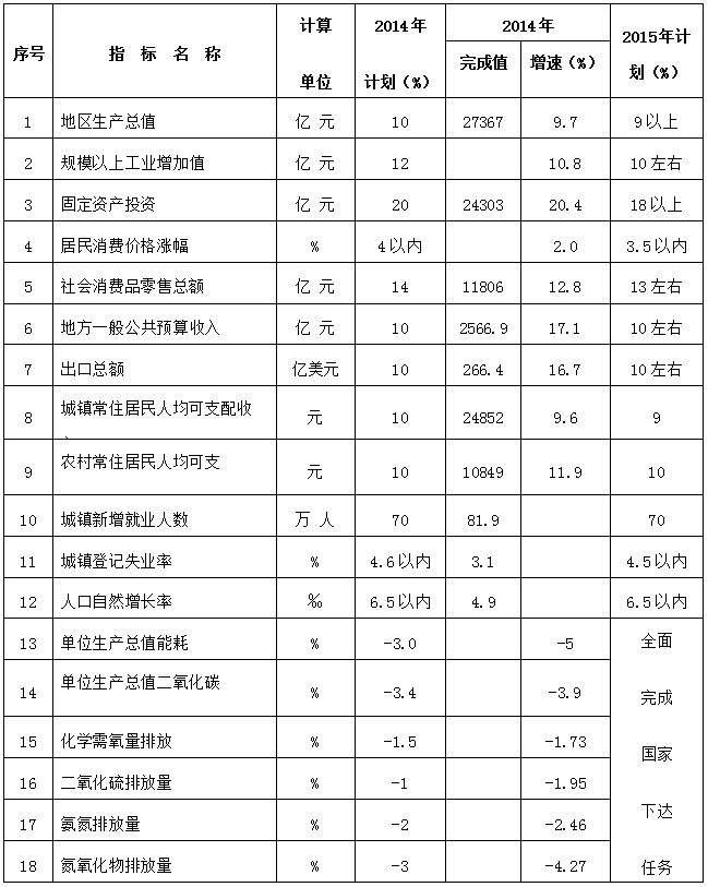 建议2015年经济社会发展的主要预期目标为:地区生产总值增长9%以上;规模以上工业增加值增长10%左右;固定资产投资增长18%以上;居民消费价格涨幅控制在3.5%以内;地方一般公共预算收入增长10%左右;社会消费品零售总额增长13%左右;出口总额增长10%左右;城镇常住居民人均可支配收入增长9%;农村常住居民人均可支配收入增长10%;城镇新增就业70万人,城镇登记失业率控制在4.5%以内;人口自然增长率控制在6.5‰以内;全面完成国家下达的节能减排任务。