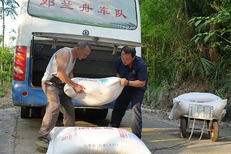 邓兰舟(右)为五峰土家族自治县怀抱窝村村民代购玉米、麸皮等,并帮助他抬上小推车。(湖北日报通讯员梅杰)