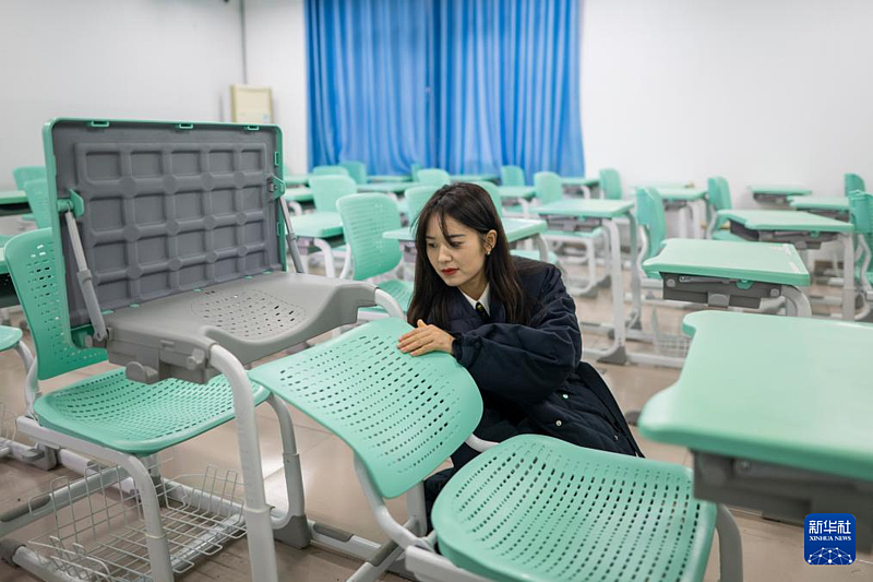 2月3日,在恩施土家族苗族自治州高级中学,张琼丽展示可以躺睡的课桌椅。
