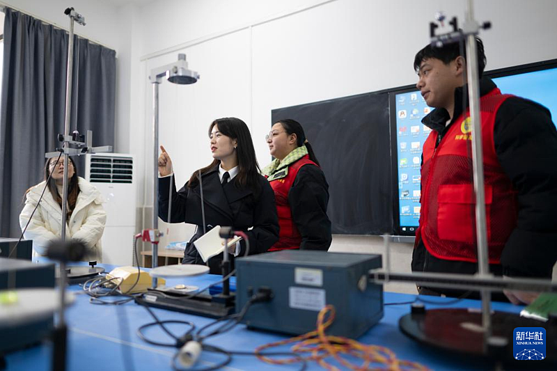 2月4日,在湖北民族大学,张琼丽(左二)与物理系科技志愿服务队队员交谈。张琼丽和湖北民族大学物理系科技志愿服务队合作,面向大中小学师生,积极开展“科普+思政”活动。