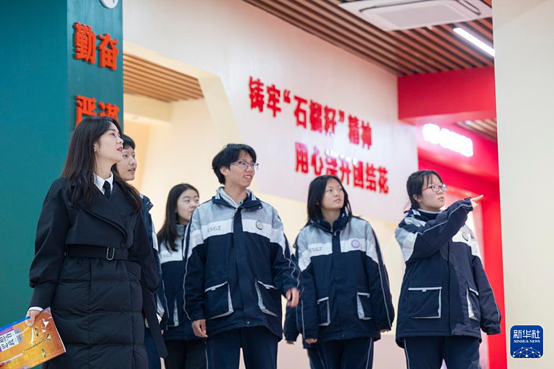 2月4日,张琼丽(左一)与几名学生参观恩施土家族苗族自治州高级中学同心馆。该校少数民族学生占比超过50%,2024年建成的同心馆,是学校进行铸牢中华民族共同体意识教育的重要阵地。