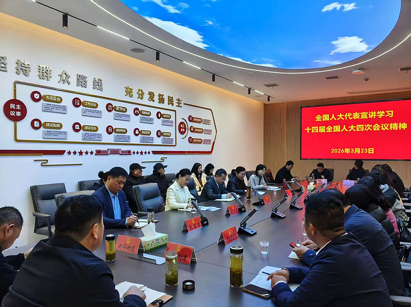 春雨如丝,润泽澴川。3月23日下午,位于孝南区广场街道槐荫桥社区的孝感全过程人民民主实践基地一楼会议室内暖意流淌,两位全国人大代表——谢志斌、张幼萍,正向市区人大代表、基层干部群众面对面宣讲全国两会精神。