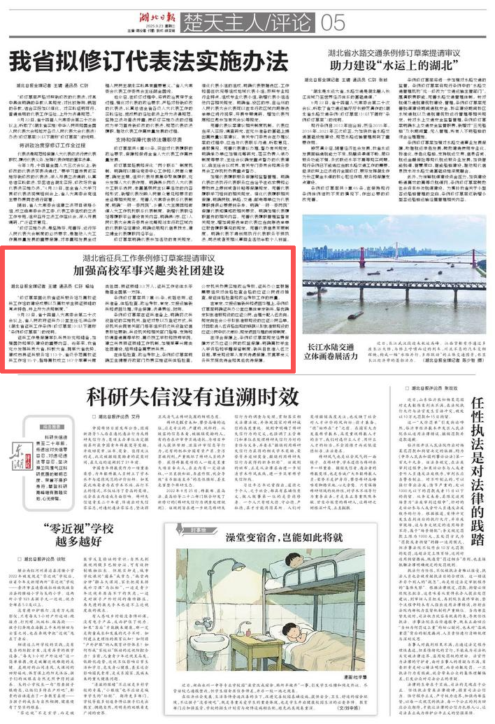 湖北日报|湖北省征兵工作条例修订草案提请审议 加强高校军事兴趣类社团建设