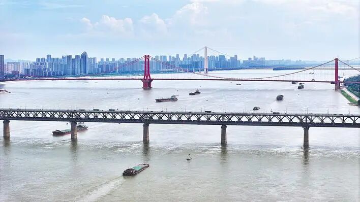 近日,长江武汉段迎来航运高峰。江面货轮有序通过多座长江大桥,与桥上呼啸而过的列车、川流不息的汽车交相辉映,构成一幅“水陆并行、多维联动”的立体交通图景,彰显长江经济带的蓬勃活力。 (湖北日报全媒记者 陈少哲 摄)