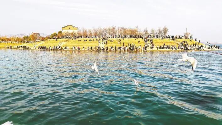 1月11日,十堰市郧阳区汉江北岸,成群红嘴鸥如精灵般飞舞,吸引不少市民前往观赏拍照。它们的到来,是对水源地生态环境的高度认可。 (视界网 李尚菲 摄)