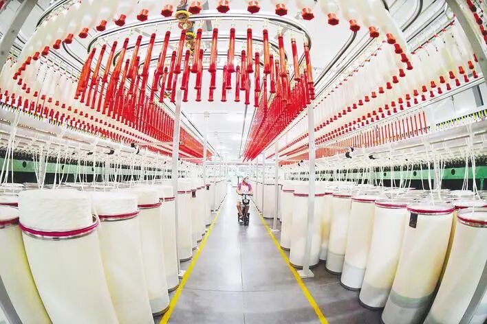 1月9日,宜城市天舒纺织有限公司智慧车间一派繁忙,几百台纺纱设备高速运转,仅有少数工人在操作面板前值守。 (视界网 安富斌 李勤 摄)