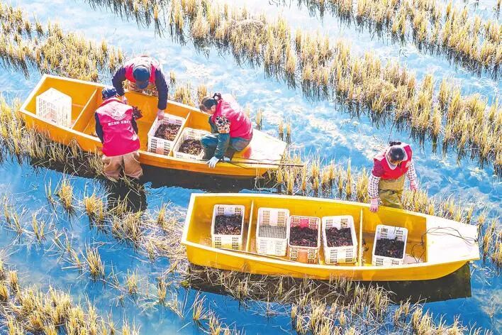上月26日,潜江市龙湾镇郑家湖“四季有虾”养殖基地,虾农们正在捕捞小龙虾。在省“虾十条”政策指引下,该市攻关“四季有虾”核心技术,实现小龙虾从“卖一季”向“卖四季”转变。 (湖北日报全媒记者 任勇 摄)