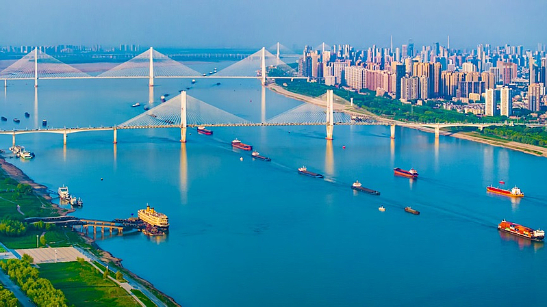 在长江武汉段江面上,货船有序穿梭,素有“黄金水道”之称的长江航运呈现一派繁忙运输景象。任勇 摄