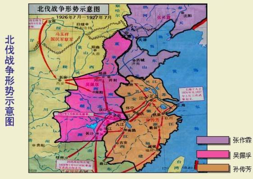 根据这个战略方针,1926年5月,国民革命军先头部队出兵湖南。7月9日,正式出师北伐。在沿途人民群众的大力支持下,北伐军势如破竹。到9月6日、7日,两湖战场的北伐军分别占领汉阳和汉口。10月10日攻克已被围困月余的武昌,全歼吴佩孚部主力。江西战场的北伐军也于11月初歼灭孙传芳部主力,占领九江、南昌。福建方面,12月中旬不战而下福州。北方冯玉祥部于9月17日在绥远五原誓师,挥军南下。11月间,国民军联军已控制陕西、甘肃等省。到1926年底,国民革命军已控制了除江苏、浙江、安徽以外的南部各省。冯玉祥的国民军联军也已控制西北地区,准备东出潼关,响应北伐军。北伐战争胜利的大局已定。