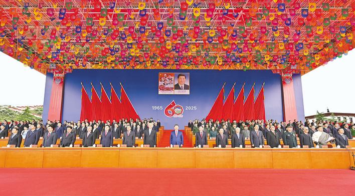 王沪宁发表讲话。他说,1965年9月,在党中央亲切关怀和党的民族政策光辉照耀下,西藏自治区宣告成立。这是西藏发展史上具有划时代意义的大事,巩固了西藏和平解放和民主改革的伟大成果,实现了西藏社会制度的历史性跨越。60年来,西藏经济社会全面发展,民族区域自治制度成功实践,民族团结日益巩固,各族人民生活蒸蒸日上,充分展现了中国共产党领导的坚强力量,充分展现了我国社会主义制度的显著政治优势。