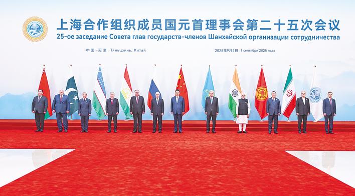 9月1日上午,上海合作组织成员国元首理事会第二十五次会议在天津梅江会展中心举行。中国国家主席习近平主持会议并发表题为《牢记初心使命 开创美好未来》的重要讲话。这是习近平同出席会议的上海合作组织成员国领导人、常设机构负责人集体合影。(新华社发)
