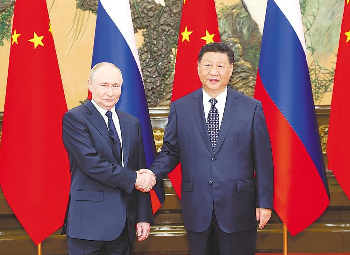 习近平指出,中俄两国元首相互出席对方国家举办的纪念世界反法西斯战争胜利庆典,充分彰显了作为第二次世界大战主要战胜国和联合国安理会常任理事国的大国担当,展示了维护二战胜利成果、捍卫正确二战史观的坚定决心。我提出全球治理倡议,就是要会同所有志同道合国家,坚定捍卫联合国宪章宗旨和原则,推动建设更加公正合理的全球治理体系。中俄两国都强调主权平等、国际法治、多边主义,要继续在联合国、上海合作组织、金砖国家、二十国集团等多边平台加强协作,携手推动构建人类命运共同体。